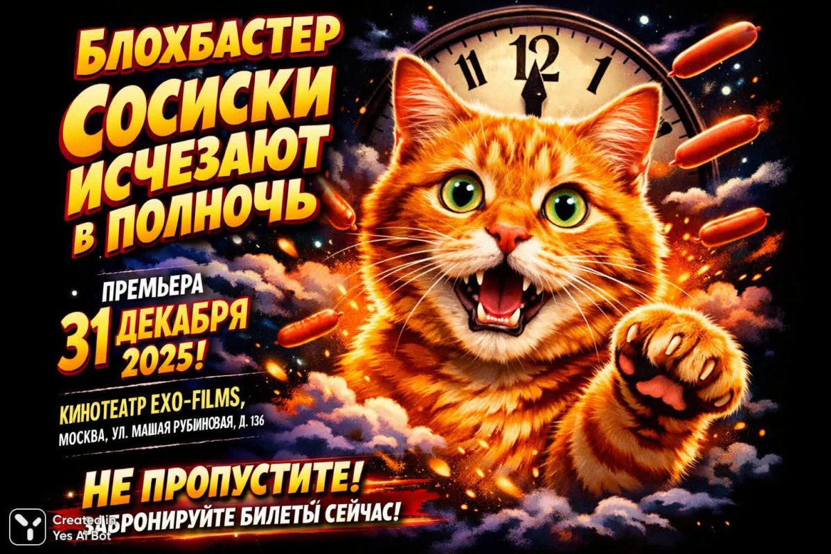 Встречайте невероятную комедийную мистику – фильм 'БлоХбастер: Сосиски исчезают в полночь'! 31 декабря 2025 года кинотеатр Exo-films, расположенный по адресу Москва, улица Малая Рубиновая, дом 136, приглашает вас на премьеру этого необыкновенного события. В центре сюжета – очаровательный рыжий кот, чья судьба переплетается с загадочным исчезновением сосисок в самый разгар ночи. Постер фильма выполнен в современном и игривом стиле, сочетая элементы комиксов и приключения. Черный фон служит идеальным контрастом для яркой цветовой палитры, подчеркивающей рыжий окрас главного героя и создающей теплую, захватывающую атмосферу. В центре композиции – выразительный взгляд рыжего кота, который обещает зрителям море юмора и тайн. На заднем плане можно увидеть облака из сосисок, уходящих в темную бездну, а над ними нависают часы, показывающие полночь - время, когда происходят самые невероятные события. Крупные, контрастные шрифты выделяют название фильма и дату премьеры, делая постер максимально заметным и привлекательным. Не упустите шанс стать свидетелем этого удивительного приключения! Забронируйте билеты прямо сейчас и приготовьтесь к незабываемому вечеру, полному смеха, тайн и сосисок, которые исчезают в полночь! Погрузитесь в мир 'БлоХбастера' и откройте для себя новые грани комедийной мистики. Это будет самый вкусный и загадочный Новый год!