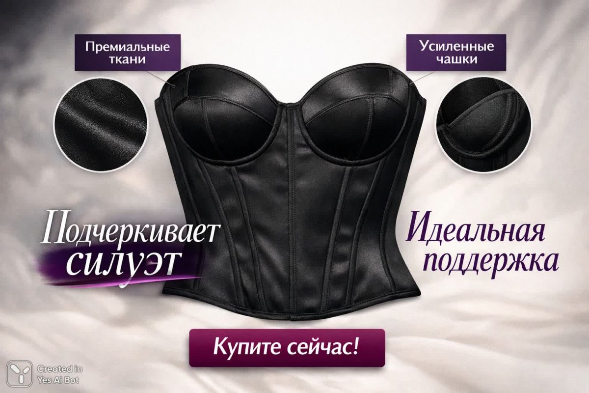 Prompt: Создайте инфографику для бюстье: фото изделия на светлом фоне, акцент на текстуре и деталях, добавьте текст «Подчеркивает силуэт, идеальная поддержка», используйте элегантный и современный шрифт. Включите кнопку с призывом к покупке. Глубокие цвета для выделения.