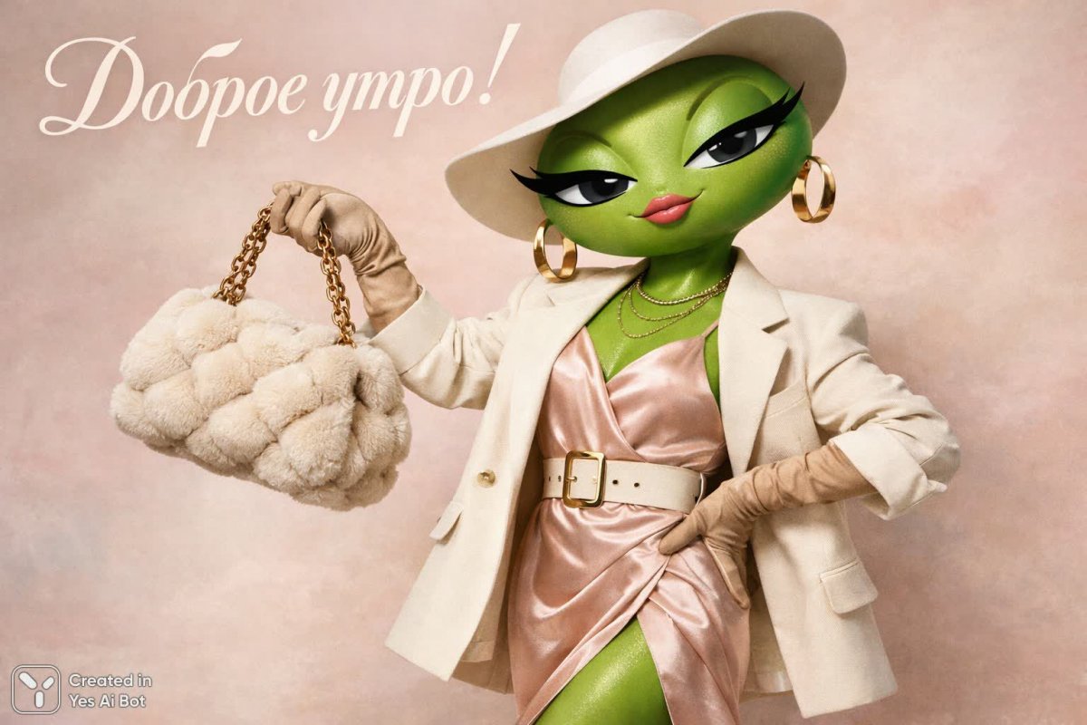 text on russian: "good morning!" a green anthropomorphic character with large slanted eyes and a puffy handbag strikes a whimsical pose, highlighting its elegant outfit against a soft pastel background.