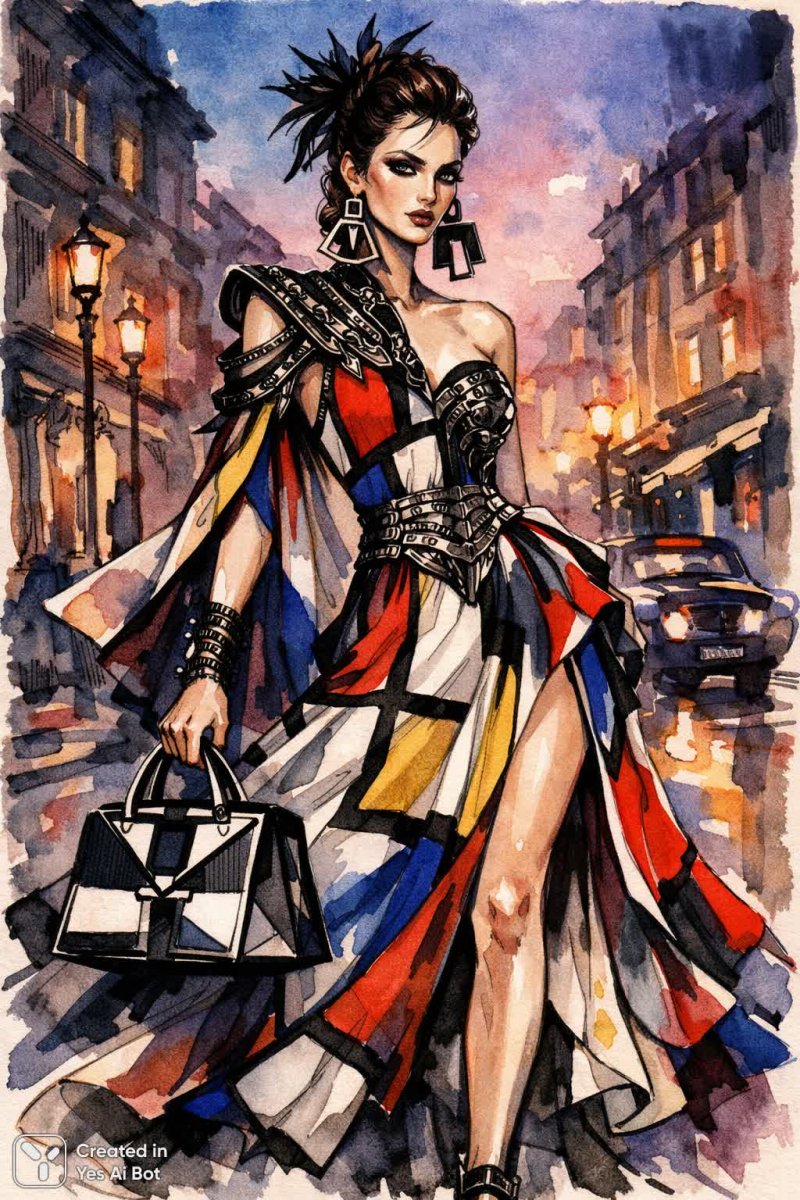 Иллюстрация в технике тушевой живописи представляет собой захватывающее сочетание модных направлений и эпох. На ней изображена стильная девушка, воплощающая смелый симбиоз авангардного стиля Александра Маккуина и культовой богемной элегантности Ив Сен-Лорана 1960-х годов. В центре внимания – струящееся шелковое платье с яркими графическими принтами, отсылающими к знаменитой коллекции YSL Mondrian, гармонично сочетающееся со сложными скульптурными элементами, характерными для творчества Маккуина. Девушка эффектно позирует на оживленной городской улице, источая уверенность и креативность, с выражением решимости в глазах. Аксессуары дополняют образ: крупные геометрические серьги и структурированная авангардная сумка подчеркивают ее индивидуальность. Атмосфера сцены пронизана мечтательным сумеречным настроением, которое мастерски передано благодаря использованию техники акварельного наложения, позволяющего выявить насыщенные цвета и мягкие тени. Картина – это визуальная ода смелости, элегантности и творческому поиску, представляющая собой уникальный сплав двух знаковых имен в мире моды. В этом изображении переплетаются дерзость современного дизайна и вневременная красота классики, создавая неповторимую эстетику, которая захватывает воображение и вдохновляет на новые свершения. Иллюстрация излучает энергию большого города и свободу самовыражения