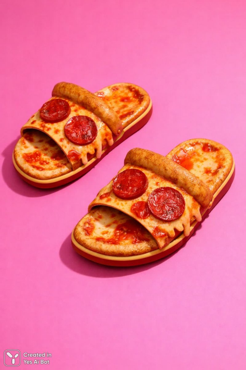 Пицца-сандалии на розовом фоне: игривый минимализм и сюрреалистичный дизайн. Генерация из нейронной сети Sora Ai Images