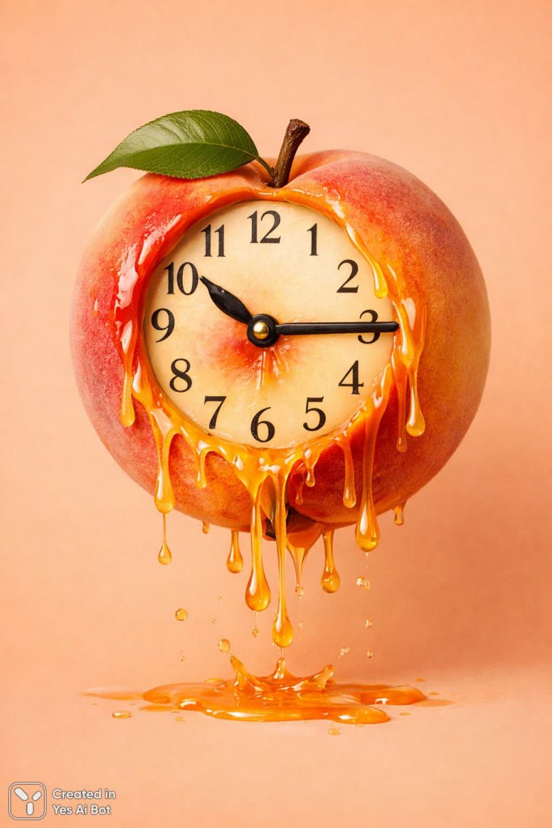 Невероятное зрелище – часы, чье лицо превратилось в огромный сочный персик, обильно стекающий сладкими соками на нежный пастельный оранжевый фон. Это гиперреалистичная картина, исполненная с потрясающей детализацией и освещенная мягким рассеянным светом. Композиция захватывает воображение, словно перенося зрителя в мир фантазий и грез. Яркие насыщенные цвета создают атмосферу сказочности и волшебства, подчеркивая абсурдность и очарование сюжета. Кажется, будто время остановилось, чтобы подарить нам этот необычный плод – персик-часы, символизирующий мимолетность мгновений и сладость бытия. Эта работа представляет собой уникальное сочетание реализма и сюрреализма, где привычные предметы приобретают совершенно новые формы и смыслы. Невозможно оторвать взгляд от этой причудливой картины, которая заставляет задуматься о природе времени, красоты и воображения. Это произведение искусства – настоящая ода творчеству и фантазии, способная вдохновить на создание собственных шедевров