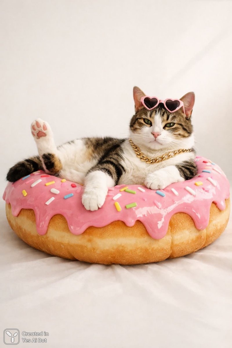 1. a playful illustration of a cat lounging on a plush donut, pink icing and sprinkles, minimalistic background, soft natural lighting, imaginative and whimsical composition, high detail.