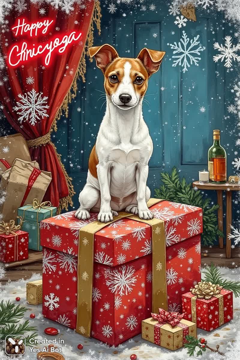 Зимнее поздравление: Джек Рассел и подарок в стиле Милли Маротта - Картинка, созданная нейросетью Flux