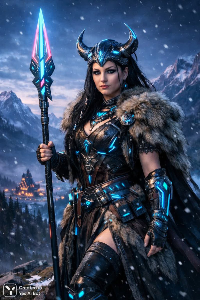 Amy Lee (Evanescence) portrays a Viking warrior in antique Viking attire with neon futuristic elements. She stands proudly on a hill, holding a technological spear whose blade glows neon. Fur covers her shoulders. Behind her, a backdrop of rocky mountains and Scandinavian forests. It's a cool evening, almost twilight, with tiny snowflakes falling to the ground. A fantastical and futuristic work of art, based on the events of the past, a masterpiece in which every detail is essential to understanding the painting as a whole.