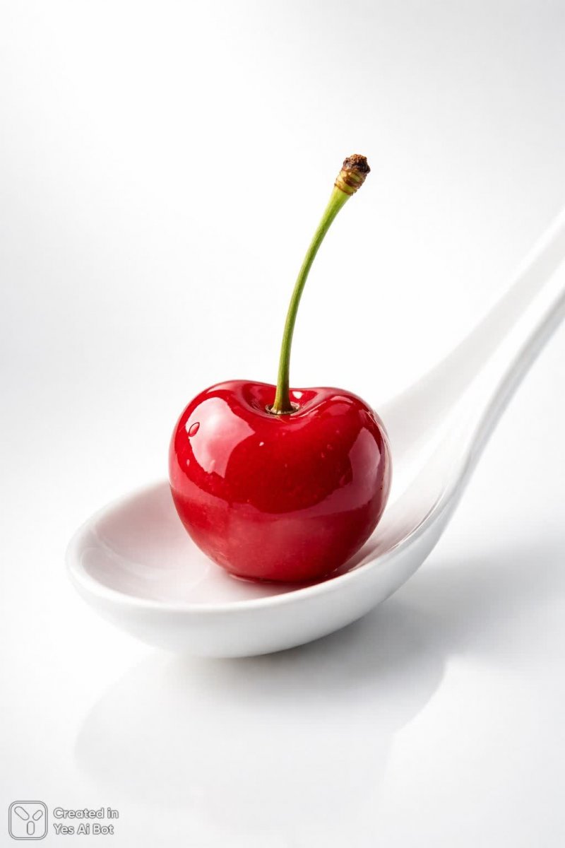 bright red cherry balanced delicately on a white ceramic spoon, light reflecting off its glossy surface, placed against a soft, gradual white gradient backdrop, studio photo, photorealistic style, captured with a Panasonic Lumix GH5 and a macro lens for extreme detail.