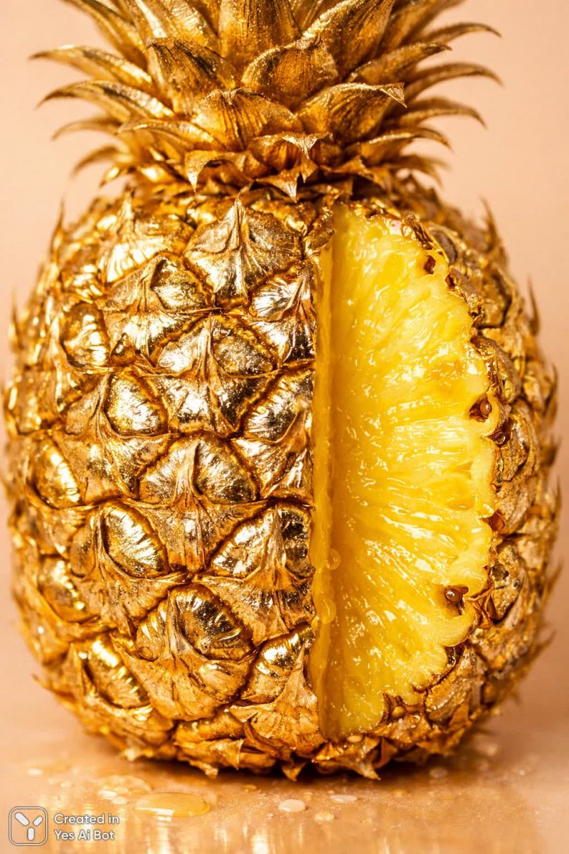 sora Сочный ананас крупным планом: золотые оттенки и нежная текстура в студийной съемке. Изображение из нейросети Sora Images