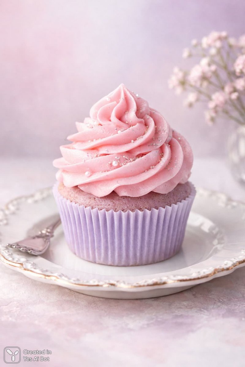 delicate lavender cupcake topped with swirls of pink frosting, placed elegantly on a vintage white plate, soft pastel backdrop to enhance colors, high-quality photography, studio lighting showcasing textures, captured with a 85mm lens for striking details.