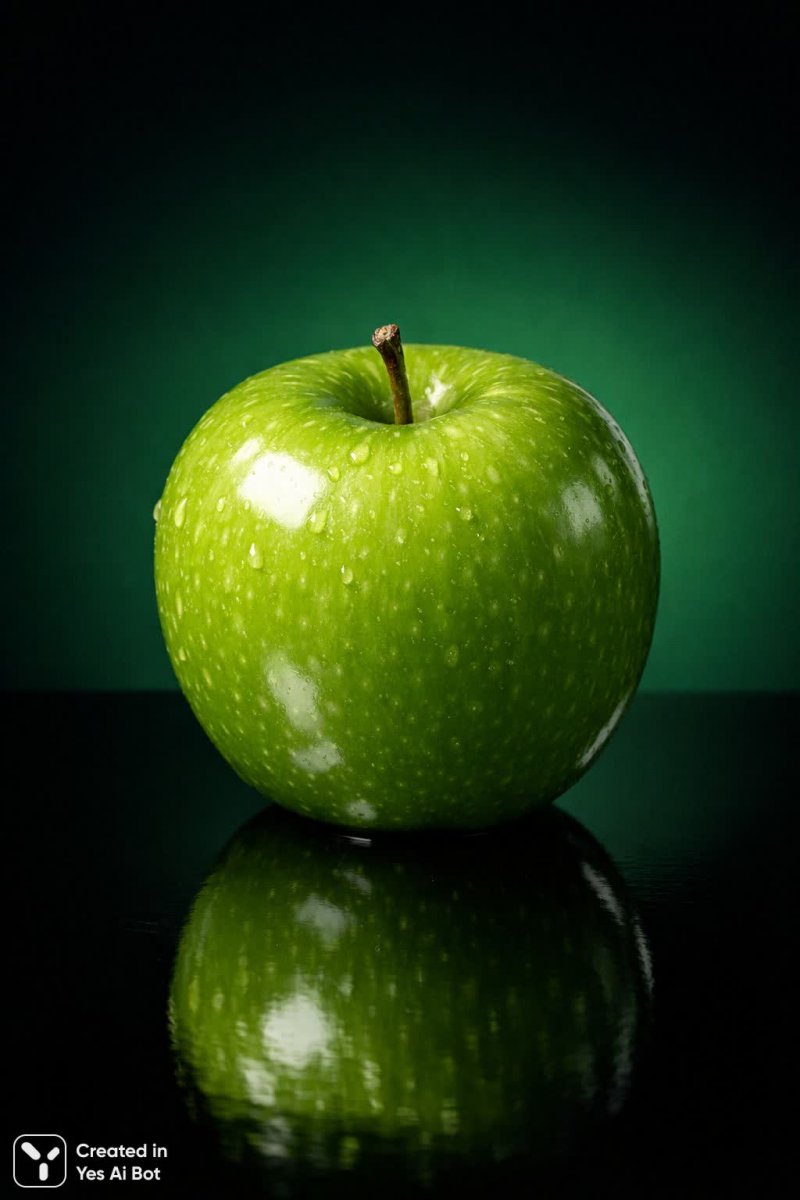 green apple with a shiny surface, placed on a reflective black surface, BG features a stylish gradient of deep green, emphasizing the apple's crisp texture, high-resolution photography, studio photo, photorealistic style, shot with a Nikon D850 and a 50mm lens for clarity.