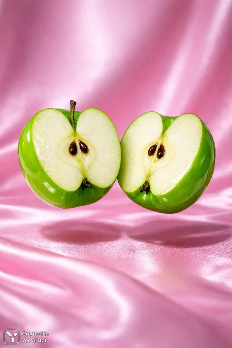 neon green apple halves floating slightly above a satin pink surface, gleaming finish, subtle shadow, studio photo, photorealistic style, sony alpha 7r iv with fe 90mm f/2.8 macro gloss lens.