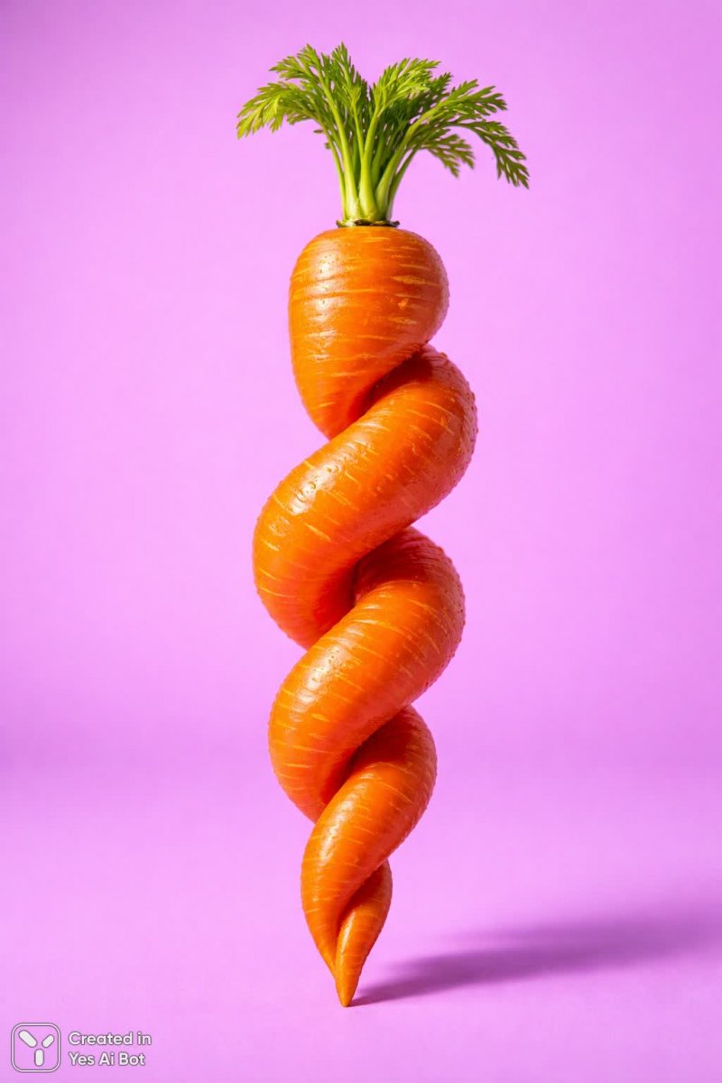 Оранжевая морковь в спирали на фиолетовом фоне: фотореалистичный студийный снимок - Картинка, созданная нейросетью Sora