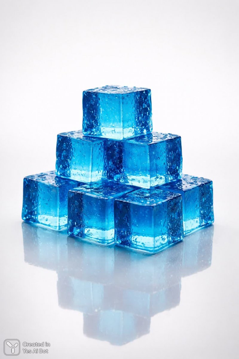 blue raspberry jelly cubes stacked in a pyramid, translucent and reflective, bright studio lighting, seamless light gray background, studio photo, photorealistic style, nikon z9 with nikkor z 105mm f/2.8 macro lens.