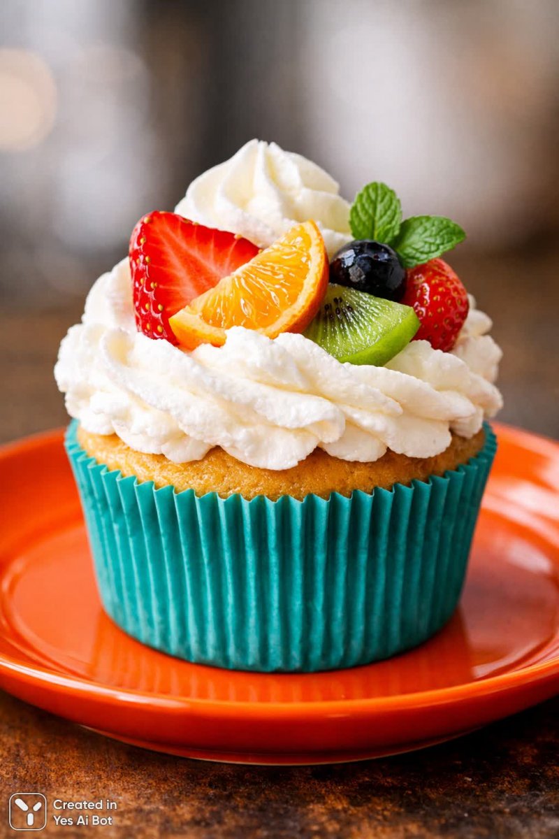 a bright teal cupcake adorned with fluffy white frosting, colorful fruit slices on top, placed on a vivid orange plate, background softly blurred to emphasize the cupcake, studio photo, photorealistic style, shot with a Nikon D850 and a 60mm macro lens for stunning detail.