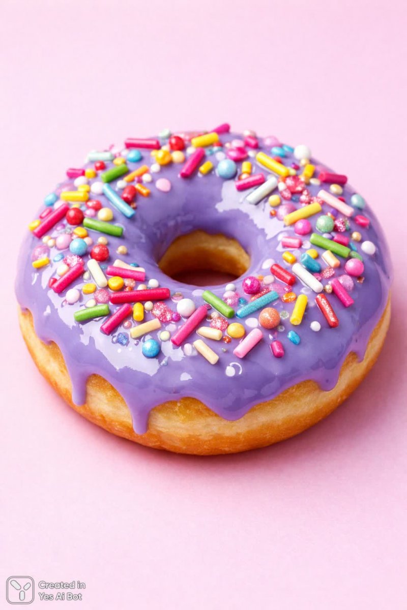 a glossy lavender donut topped with vibrant sprinkles, set against a soft pastel pink background, capturing intricate details of the sprinkles and glaze, studio photo, photorealistic style, taken with a Canon EOS R5 and a 100mm macro lens for high-quality results.