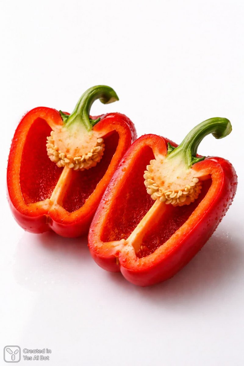 a striking red bell pepper halved, showcasing its glossy surface and bright seeds, set on a vivid white background, highlighting the freshness and color contrast, studio photo, photorealistic style, taken with a Fujifilm GFX 100 and a 120mm macro lens for exquisite detail.
