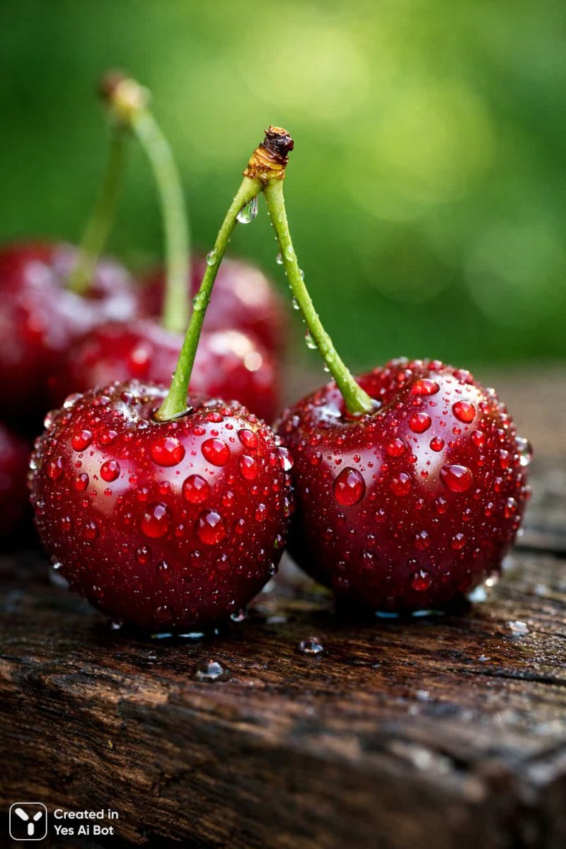 Сочные вишни в капельках росы: макросъемка с естественным освещением - Пример генерации нейросети Sora Images