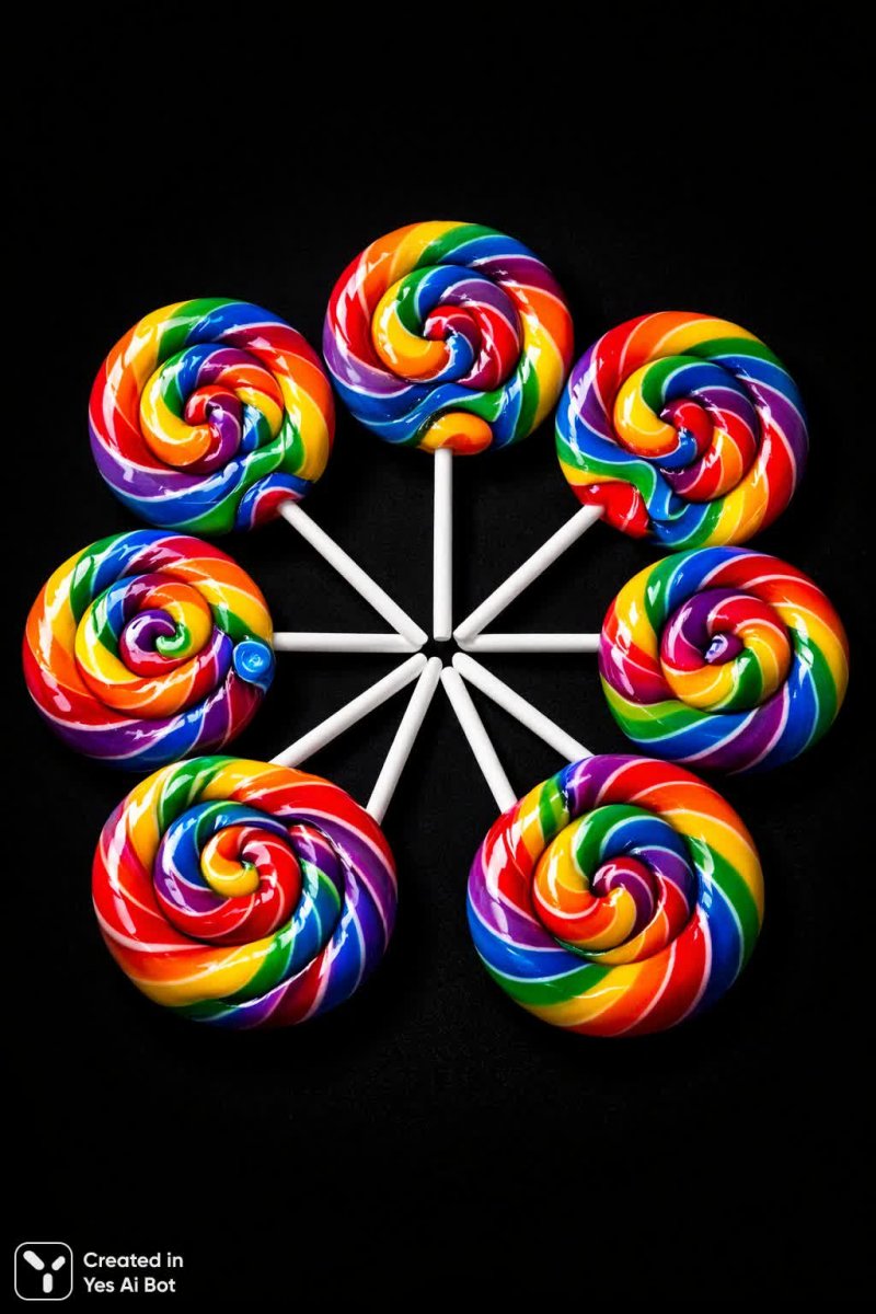 vibrant rainbow lollipops arranged in a circular pattern, glossy surfaces reflecting light, displayed against a stark black background, creating a dramatic effect, studio photo, photorealistic style, taken with a Leica SL2 and 90mm macro lens for sharp focus.