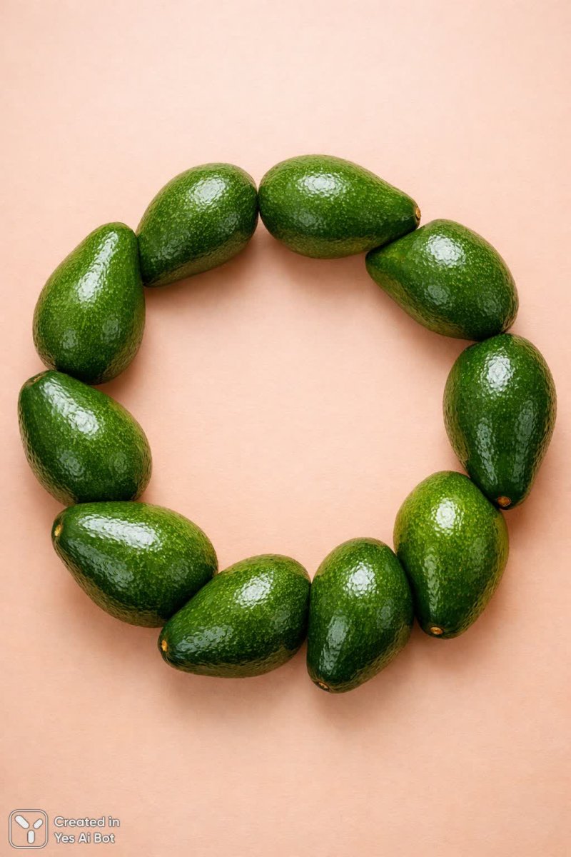 lush green avocados arranged in a circular pattern, showcasing smooth skin and rich texture, set against a soft pastel peach background, high detail capturing their freshness, studio photo, photorealistic style, shot with a Panasonic Lumix S1R and a 24mm lens for high-quality results.