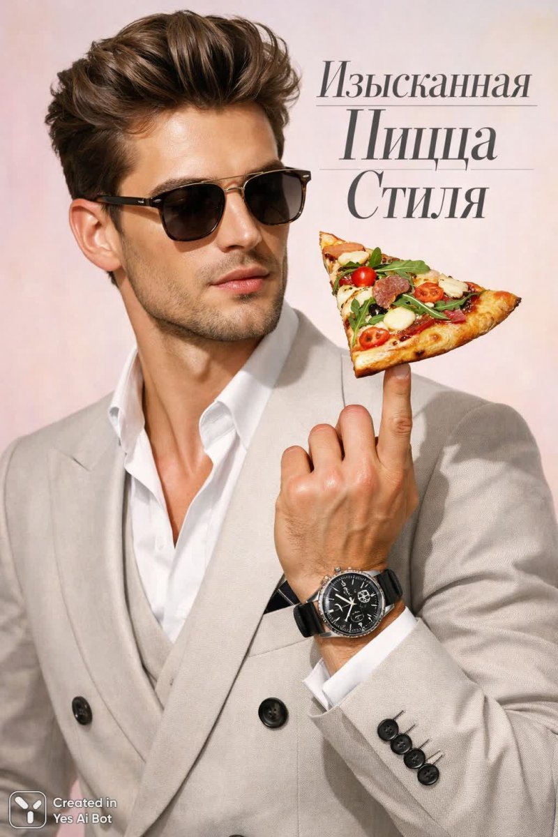 Невероятное сочетание высокой моды и гастрономического удовольствия запечатлено в этом ярком образе. Молодой человек, безупречно одетый в элегантный костюм, демонстрирует не только безупречный вкус, но и чувство юмора, ловко удерживая аппетитный кусочек изысканной пиццы на кончике пальца. Внимание к деталям подчеркивает его статус: акцент сделан на стильных часах, которые становятся завершающим штрихом в этом тщательно продуманном образе. Мягкий пастельный фон создает атмосферу утонченности и легкости, не отвлекая от главного героя и его необычного занятия. Это визуальная метафора, объединяющая мир моды и кулинарии, где изысканность проявляется в самых неожиданных сочетаниях. Картина излучает уверенность, стиль и неповторимую харизму молодого человека, который с легкостью совмещает серьезность делового костюма и беззаботное удовольствие от вкусной еды. Он олицетворяет современную эпоху, где границы между разными сферами жизни стираются, создавая новые возможности для самовыражения и наслаждения моментом. В этом образе есть что-то дерзкое и одновременно изысканное, что не оставляет равнодушным зрителя и заставляет задуматься о том, как важно находить баланс между работой и удовольствием, между строгим дресс-кодом и спонтанными радостями жизни. Это настоящий манифест стиля и вкуса, воплощенный в одном запоминающемся кадре