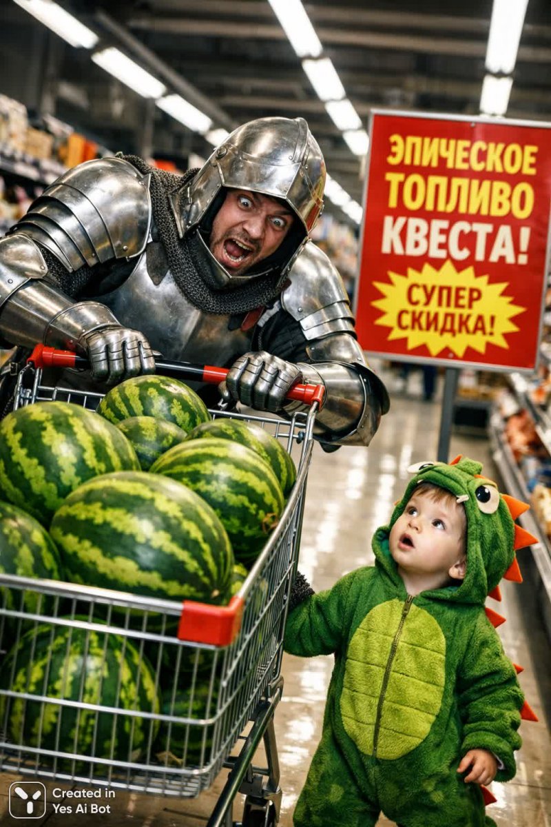 meme, photorealistic, shot with canon eos r5, 50mm f/1.8, dynamic angle, high-quality, vivid colors, medieval knight in full armor struggle-pushing a shopping cart full of watermelons down a modern supermarket aisle, bewildered toddler in dragon costume peers up at knight, knight’s visor lifted to reveal panicked face, sarcastic special offer sign reads on Russian: “epic quest fuel,” fluorescent lights reflecting on polished floor tiles