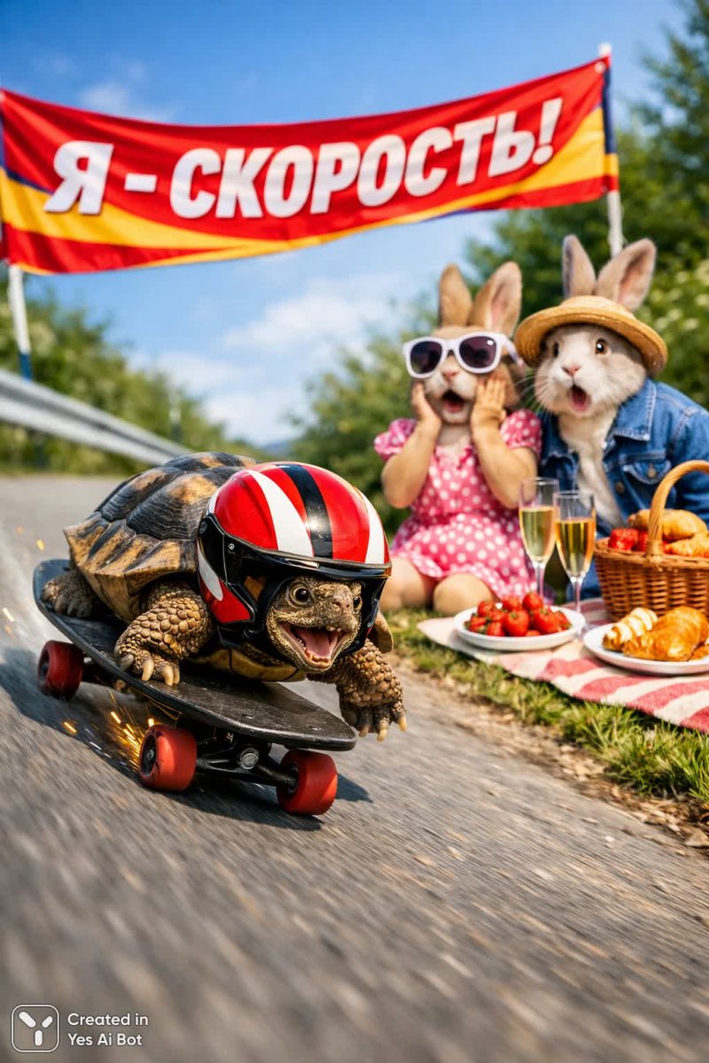 4. meme, photorealistic, shot with canon eos r5, 50mm f/1.8, dynamic angle, high-quality, vivid colors, tortoise wearing a racing helmet zooming down a hill on a skateboard, surprised rabbits watching from a roadside picnic, vibrant banner fluttering reads "Я - СКОРОСТЬ!", text on Russian