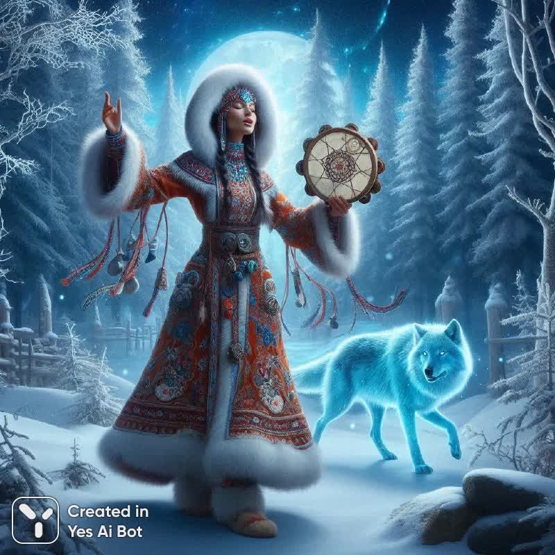 Затерянная в морозной глуши якутская колдунья, облаченная в меховую одежду и традиционные унты, проводит древний обряд. Ее голос, усиленный ритмичными ударами бурульдака (шаманского барабана), разносится над заснеженной поляной, окруженной деревьями, покрытыми серебристым инеем. В ответ на ее заклинания из глубин леса возникает величественный дух волка, чье сияние окрашивает снег в неземной голубой цвет. Ночное небо, усыпанное мириадами звезд, лишь подчеркивает таинственную атмосферу происходящего, словно сама вселенная внимательно следит за священным действом. Эта картина – воплощение древней якутской культуры, где границы между миром людей и духовной сферой стираются, а шаман выступает посредником, способным призвать силы природы и установить связь с потусторонним. В каждом движении колдуньи чувствуется ее сила и мудрость, передаваемые из поколения в поколение. Звуки бурульдака сливаются с шепотом ветра, создавая завораживающую мелодию, проникающую в самую душу, и заставляя поверить в реальность чудес. Это момент единения человека с природой и духами предков, наполненный древней магией и непоколебимой верой