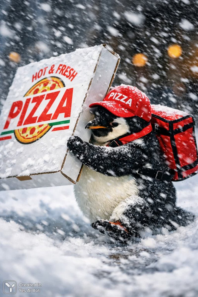 1. meme, photorealistic, shot with canon eos r5, 50mm f/1.8, dynamic angle, high-quality, vivid colors, pizza delivery penguin struggling to carry an oversized pizza box, waddling through a blizzard, its tiny face determined, flurries swirling dramatically.