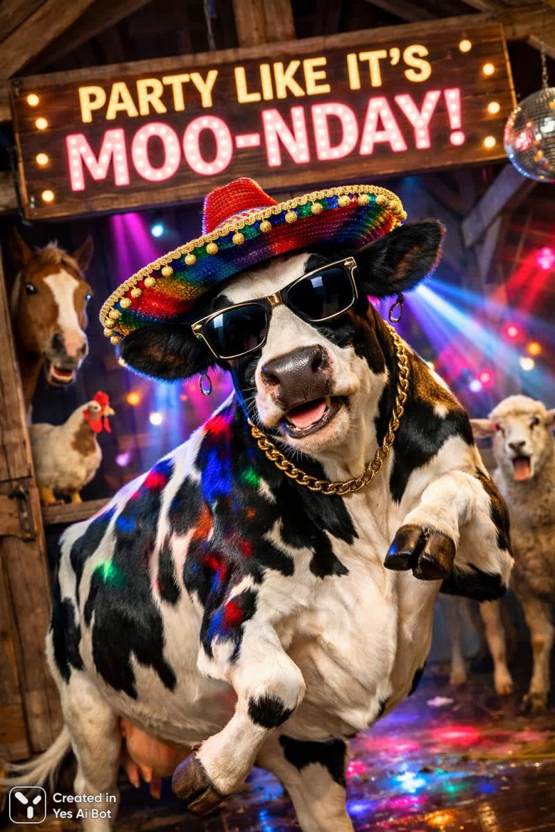 Безудержное веселье на ферме! Этот фотореалистичный мем запечатлел невероятную картину: корова в сомбреро и солнцезащитных очках отплясывает в диско-клубе под яркими разноцветными огнями, отражающимися в ее пятнах. Динамический ракурс камеры Canon EOS R5 с объективом 50mm f/1.8 позволяет зрителю ощутить всю энергию и атмосферу безумной вечеринки. Удивленные фермерские животные выглядывают из хлева, наблюдая за необычным представлением. Над танцующей коровой красуется табличка с надписью 'Party like it's moo-nday!', что добавляет юмора и подчеркивает абсурдность происходящего. Яркие цвета и высокое качество изображения создают поистине запоминающийся визуальный опыт, передающий атмосферу радости, беззаботности и креативного настроения. Эта забавная сцена идеально подходит для поднятия настроения и демонстрации чувства юмора в социальных сетях. Фотография является настоящим праздником визуальной изобретательности и сочетает в себе реализм и абсурдность в уникальном и привлекательном стиле, гарантируя мгновенную узнаваемость и вирусный эффект