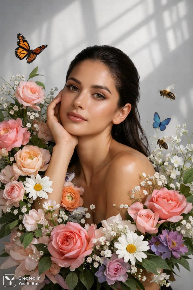 a woman posing with smooth, natural matte skin, surrounded by an artistic arrangement of colorful flowers, intertwined soft petals and delicate leaves, wearing elegant white gloves, bees and butterflies hovering, minimalist light-gray backdrop, dramatic window shadows, soft focus, high fashion editorial style, contemporary crisp details