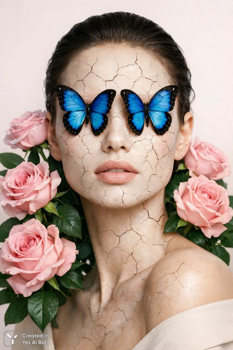 Необыкновенный портрет женщины, где реальность переплетается с сюрреалистичным образом. Кожа модели имеет потрескавшуюся матовую текстуру, а взгляд её заменен на пару ярких синих бабочек, словно символ хрупкости и преображения. Её окружает пышное буйство распустившихся розовых роз и сочная зелень листьев, создавая контраст между нежностью цветов и загадочностью лица. Мягкий пастельный фон придает изображению воздушность и утонченность, а минималистичная композиция фокусирует внимание на деталях и выразительности сюжета. Каждая деталь проработана с высокой точностью: от текстуры кожи до мельчайших прожилок на лепестках роз – все это создает ощущение погружения в фантастический мир. Портрет излучает атмосферу таинственности, умиротворения и некой меланхолии, заставляя зрителя задуматься о природе красоты и эфемерности жизни. Это не просто изображение, а скорее поэтическое высказывание, воплощенное в художественной форме, где природа и человеческая красота сливаются воедино в едином гармоничном образе. Произведение наполнено символизмом, предлагая зрителю собственную интерпретацию увиденного