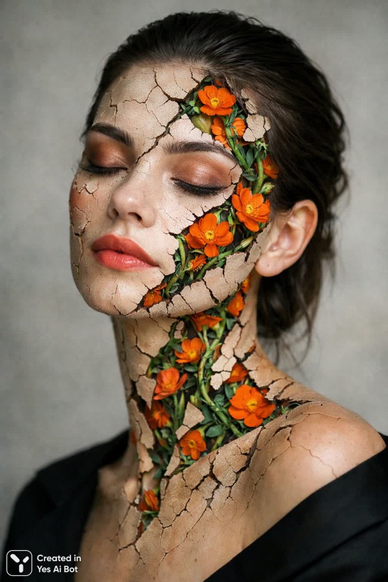 Изображение представляет собой завораживающий абстрактный портрет женщины, где контраст между внешней хрупкостью кожи, испещрённой трещинами, и скрытым внутри буйством жизни становится центральной темой. Из этих разломов пробиваются яркие оранжевые цветы и изумрудные лианы, символизируя удивительное сочетание увядания и возрождения, демонстрируя внутреннюю силу и красоту. Выражение лица модели излучает спокойствие и нереальность, создавая впечатление отрешенности от мира или погружения в состояние медитации, словно она видит сны наяву.