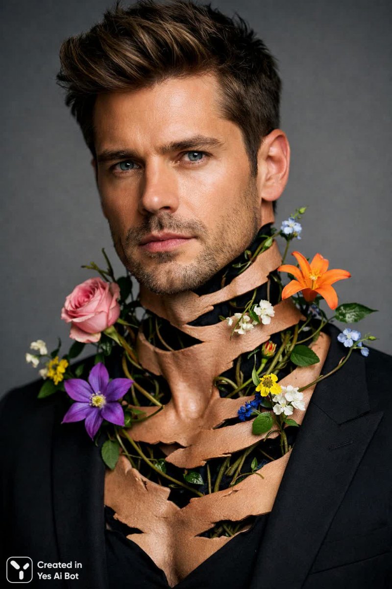 professional photo, sony alpha a7r iv, 85mm f/1.4, close-up, studio lighting, photorealistic, a detailed portrait of a man with translucent gaps in his neck and shoulders, revealing intertwined vines and colorful flowers, intricate blending of realistic skin and ornamental elements, ultra detailed, high definition