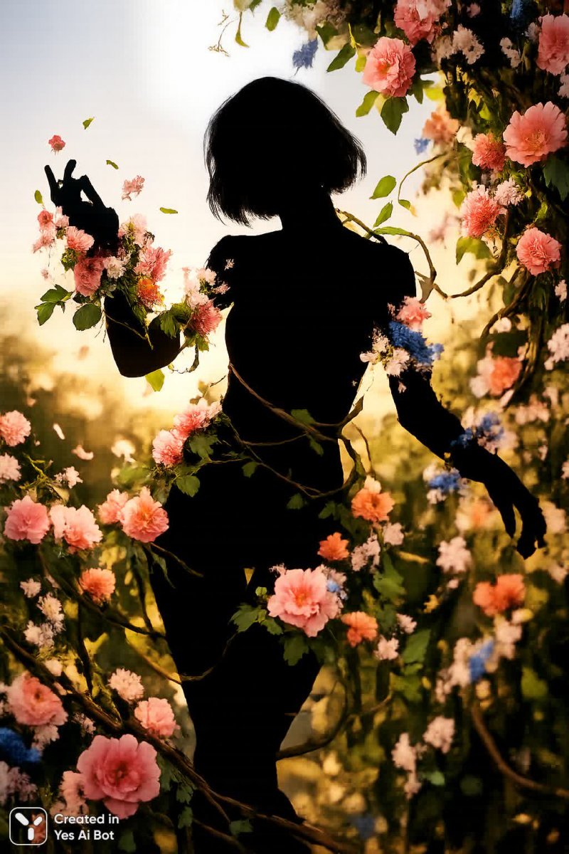 Неуловимое прикосновение: игра света и тени в объятиях цветов и лозы - Картинка, сгенерированная нейросетью Sora Image
