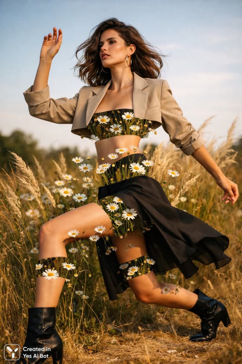 Изображение представляет собой фотореалистичную картину, созданную нейросетью Sora, выполненную в стилях фэшн и люкс. На фотографии запечатлен человек, находящийся в динамичной позе на залитом солнцем поле, но с сюрреалистичным эффектом: части его тела, включая ноги и торс, словно исчезают, обнажая красочный фон из ромашек и декоративных трав. Кадр, снятый под углом три четверти при студийном освещении профессиональным оборудованием Canon EOS R5 и объективом Sigma Art 35mm, отличается потрясающей детализацией и кинематографическим оттенком. Композиция тщательно продумана, а игра света и тени создает ощущение глубины и объема, позволяя зрителю ощутить атмосферу мечтательности и загадочности. Изображение передает иллюзию мимолетного существования, намекая на быстротечность жизни и побуждая к размышлениям о природе времени. Общее впечатление - это произведение искусства, вызывающее сильные эмоции и оставляющее неизгладимый след благодаря невероятной четкости, реалистичности и мастерству исполнения.