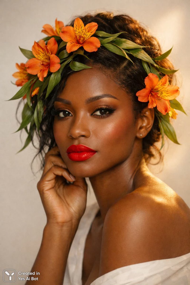 portrait of a thoughtful woman with rich, matte complexion and striking red lips, her head entwined with vibrant orange flowers and flowing green leaves, ethereal golden hour lighting, clean neutral backdrop, olympus om-d, 25mm lens, sharp focus and detail.