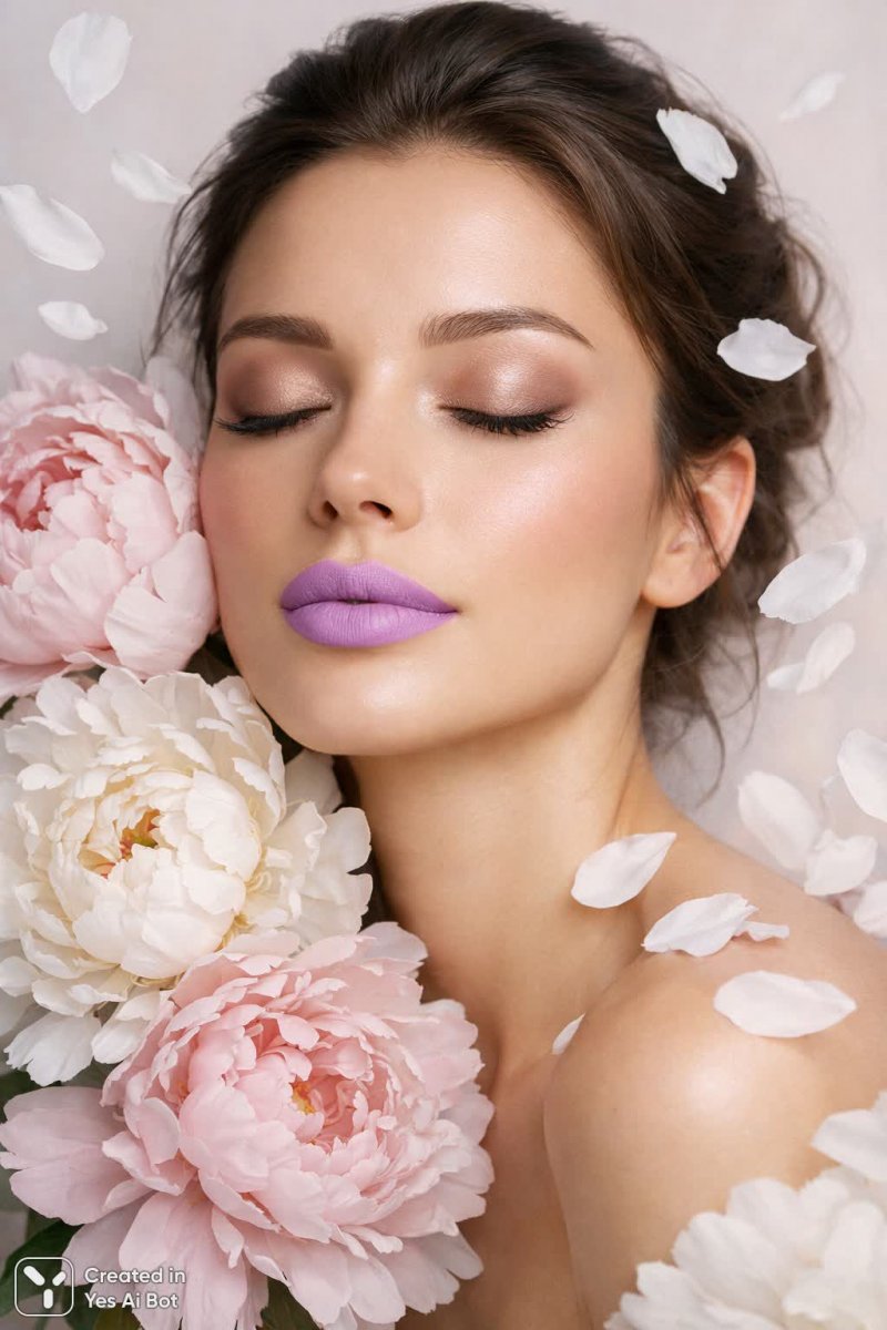 dreamy portrait of a woman with matte skin and appealing lavender lips, surrounded by lush peonies and delicate white petals, her serene eyes closed, light pastel background, soft shadows, sony a7r, 35mm lens, artistic clarity.