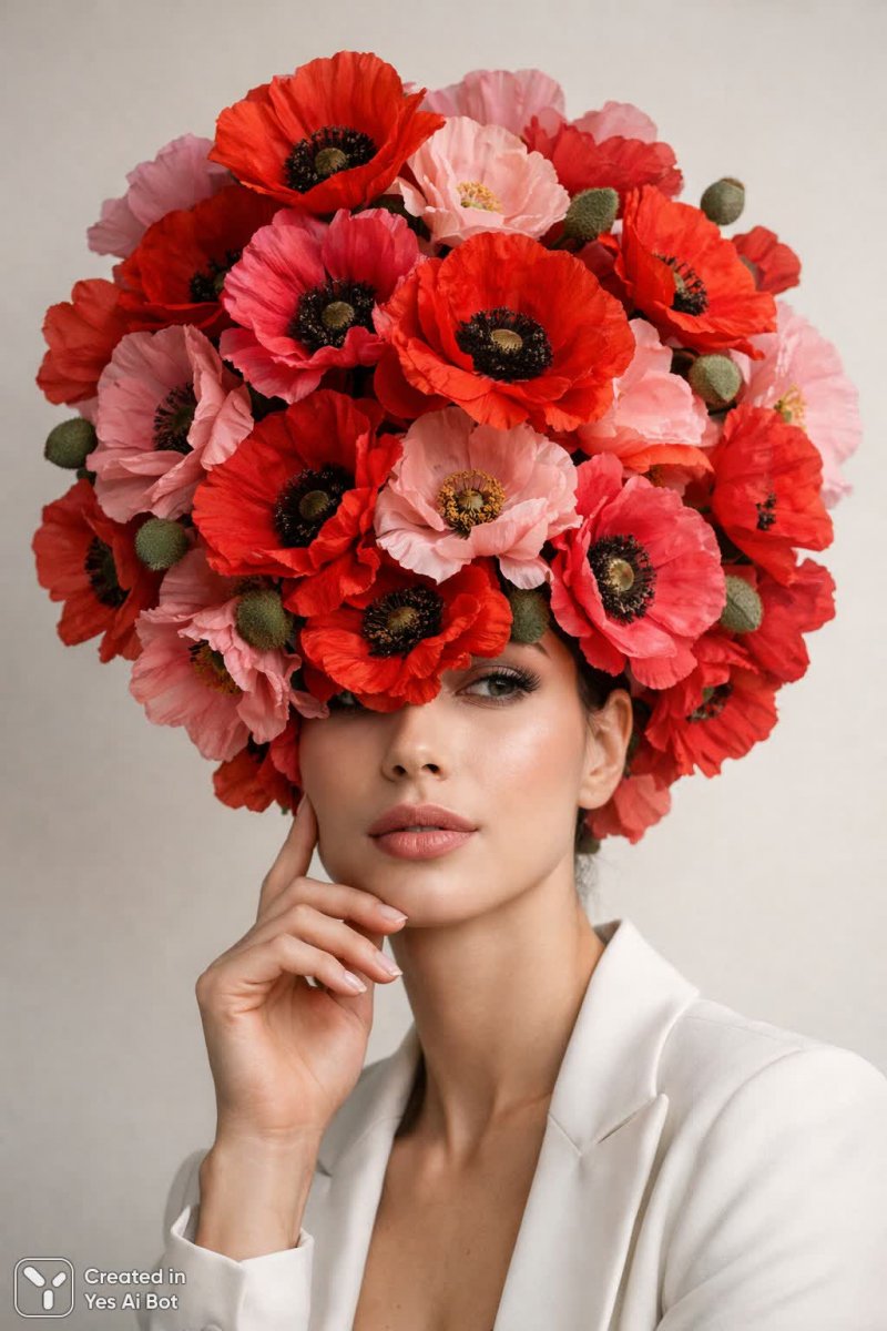 4. surreal portrait of a thoughtful woman with smooth skin, head transformed into a collage of vivid red and pink poppies, gentle light against a neutral background, high clarity, modern fine art style, fuji x-t4, 23mm lens.