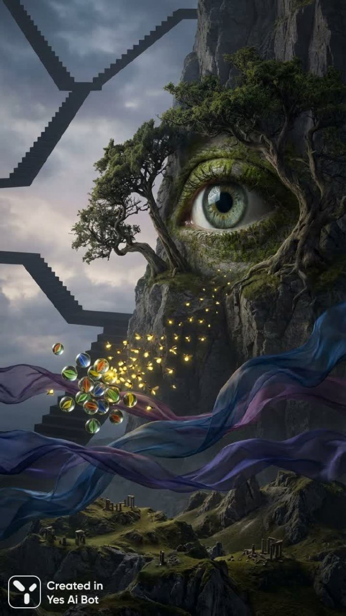 Завораживающая сюрреалистичная сцена, запечатленная профессиональной фотографией с использованием Canon EOS R5 и объектива Sigma Art 35mm. Широкоугольный кадр погружает зрителя в мир гиперреализма и ультрадетализации, созданный искусственным освещением студии и кинематографической подачей. В центре композиции – огромный человеческий глаз, интегрированный в скалу, словно свидетель вечного покоя. Деревья склоняются, будто внимательно слушая невидимый диалог, а стеклянные шарики взрываются каскадом мерцающих светлячков, создавая иллюзию волшебства и мимолетности. Тенистые силуэты лестниц, уходящих в никуда, добавляют ощущение загадочности и неопределенности, приглашая зрителя задуматься о скрытых смыслах и неизведанных путях. Шелковые ленты, текущие подобно бурным рекам над искаженным пейзажем, усиливают контраст между умиротворением и хаосом, создавая ощущение дежавю и размытия границ реальности. Эта работа – визуальная поэма о хрупкости мира и бесконечности воображения, где обыденное переплетается с фантастическим, а привычные формы приобретают новые, неожиданные значения. Кажется, что это снимок из странного и безмятежного сна, сотканного из образов, которые одновременно пугают и завораживают своей красотой и глубиной. Это настоящий шедевр сюрреализма, демонстрирующий мастерство фотографа в создании неповторимой атмосферы таинственности и волшебства
