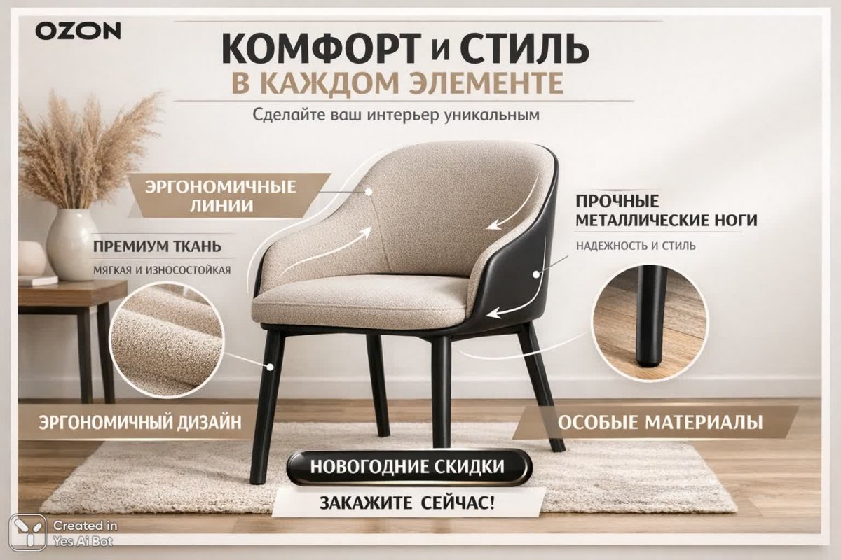 Создайте инфографику для карточки дизайнерского стула: на фото стул в интерьере, фоновый цвет светлый и мягкий, добавьте текст “Комфорт и стиль в каждом элементе. Сделайте ваш интерьер уникальным”, выделите эргономичные линии стула. Используйте шаблон SUPA.ru, акцентируйте внимание на особых материалах и дизайне, большими буквами. Добавьте кнопку "Новогодние ски...