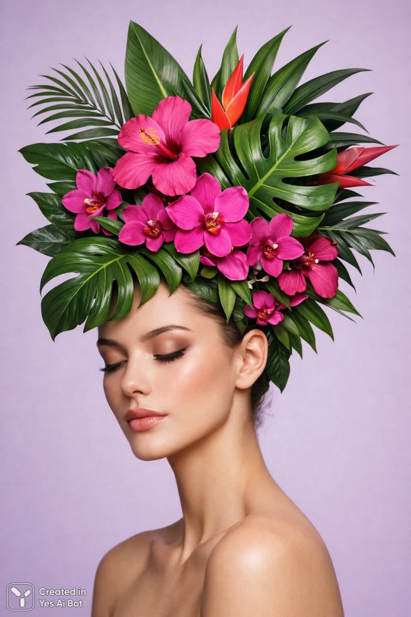 1. surreal portrait of a woman with smooth, matte skin, delicate features, and her head transforming into a vivid arrangement of tropical leaves and vibrant pink flowers, soft lilac background, high clarity, fine detail, balanced composition, shot with a canon eos 5d, 50mm lens, photorealism.