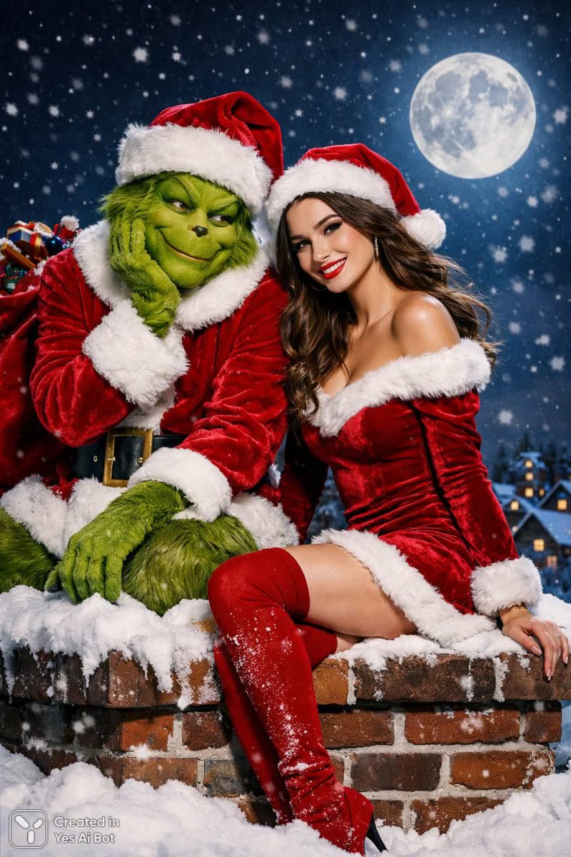 4. playful scene with the grinch in a red santa suit next to a young woman in a matching velvet dress, winter night sky, sitting on a brick chimney, snow-covered ground, eye-level shot, canon eos r5, rf 24-70mm f2.8l lens, studio lighting, ultra high resolution, festive atmosphere.