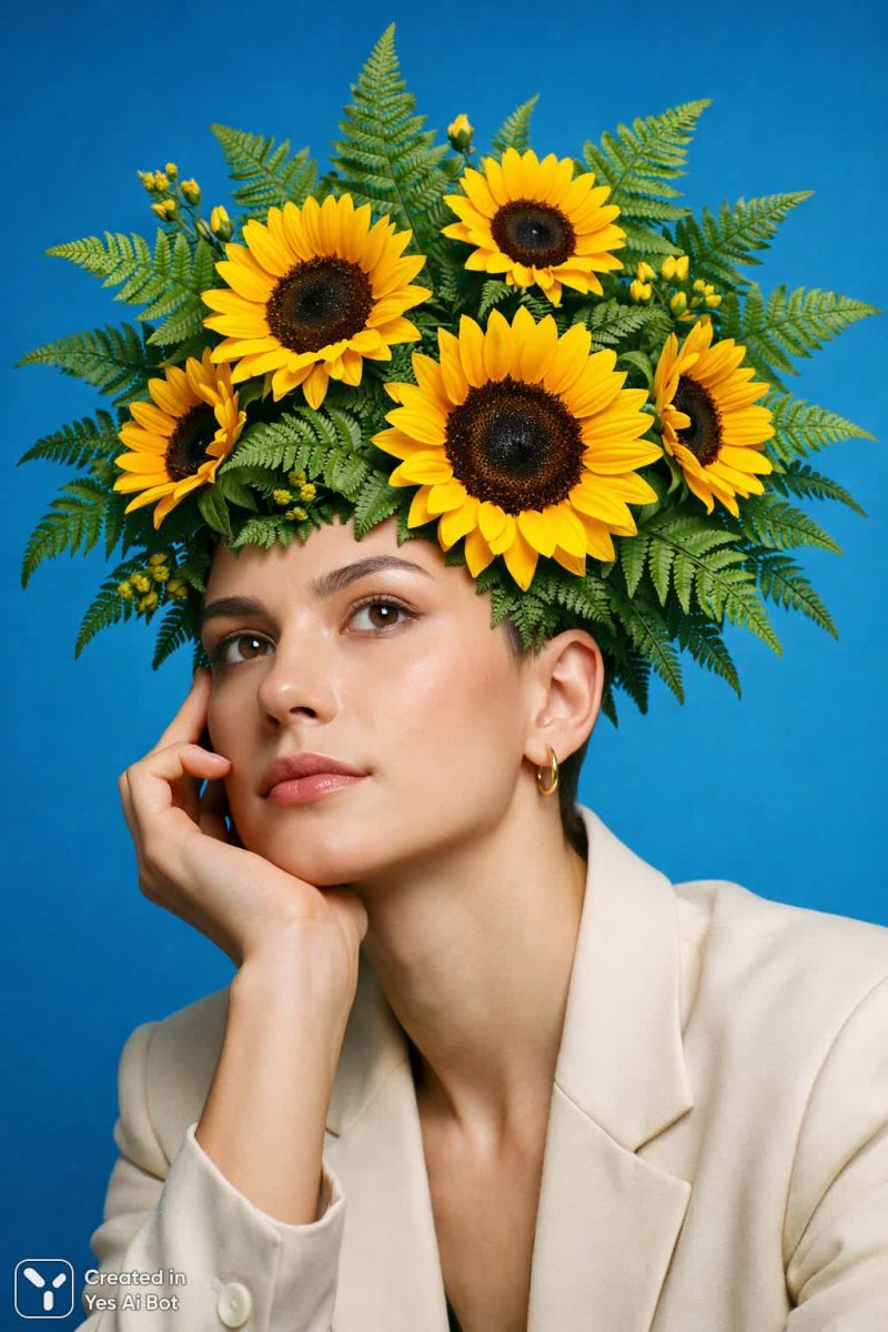 surreal portrait of a thoughtful person with clear, matte skin, their head blooming into an arrangement of vibrant sunflowers and emerald ferns, set against a solid cerulean backdrop, modern digital collage style, quality tokens for photorealism, sharp details, 35mm lens, wide angle shot.