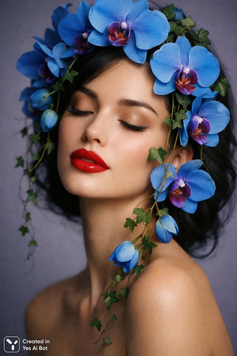 a surreal portrait of a woman with smooth, matte skin, vibrant crimson lips, and delicate facial features, adorned with cascading blue orchids and lush green ivy tendrils, against a muted lavender background, photorealistic rendering, 85mm lens, cinematic lighting, shallow depth of field.
