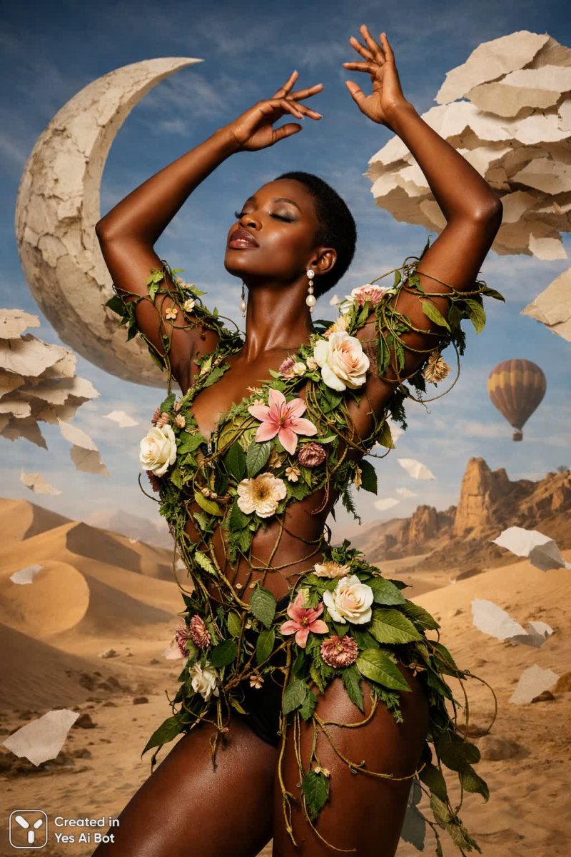 surreal art, professional photo, canon eos r5, sigma art lens 35mm, wide angle, photorealistic, hyper-realism, ultra detailed, studio lighting, cinematic, strange dreamlike a black woman in the desert, posing with her arms raised, collage art style, floral armor made of vines and leaves.