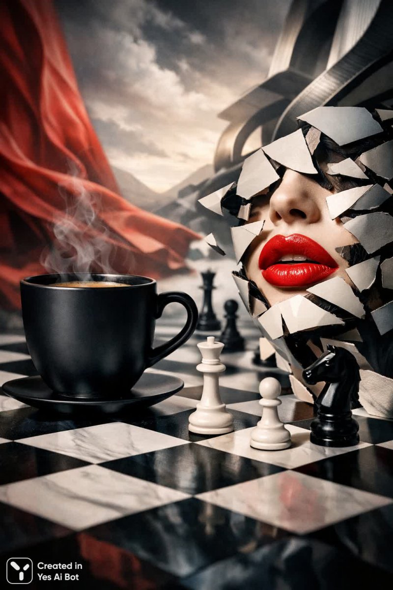 Завораживающая сюрреалистическая иллюстрация представляет собой визуальное исследование подсознания и фрагментации личности. В центре композиции – изящная чёрная чашка с кофе, символизирующая утреннюю рутину или момент размышлений, контрастирующая с хаотичной красотой окружающей среды. Рядом расположена шахматная доска, намекающая на стратегию, борьбу и принятие решений в жизни, а также на сложность человеческого разума. Самым ярким и загадочным элементом произведения являются красные губы, возникающие из фрагментированного лица. Этот образ может интерпретироваться как символ страсти, желания или скрытых эмоций, вырывающихся наружу сквозь маску рациональности. Разрушенное лицо говорит о внутренних конфликтах, травмах или потере идентичности. Фон изображения представляет собой калейдоскоп сдвигающихся реальностей и текущих форм, создающий ощущение дезориентации и погружения в мир грез. Использование плавных переходов и абстрактных элементов усиливает сюрреалистический эффект, позволяя зрителю ощутить состояние потока сознания и неопределённости. Цветовая палитра, основанная на контрасте чёрного и красного на фоне нейтральных тонов, добавляет драматизма и привлекает внимание к ключевым элементам композиции. В целом, иллюстрация является сложным и многослойным произведением искусства, затрагивающим темы самопознания, идентичности и хрупкости человеческого существования в постоянно меняющемся мире. Это визуальная метафора о том, как наше восприятие реальности может быть искажено внутренними переживаниями и внешними обстоятельствами