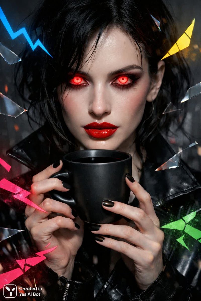 2. a dreamlike piece showcases a person with neon scarlet eyes, red lips, and a matte black coffee cup, surrounded by broken lines and geometric figures of different colors of emotions, creating a feeling of anxiety.