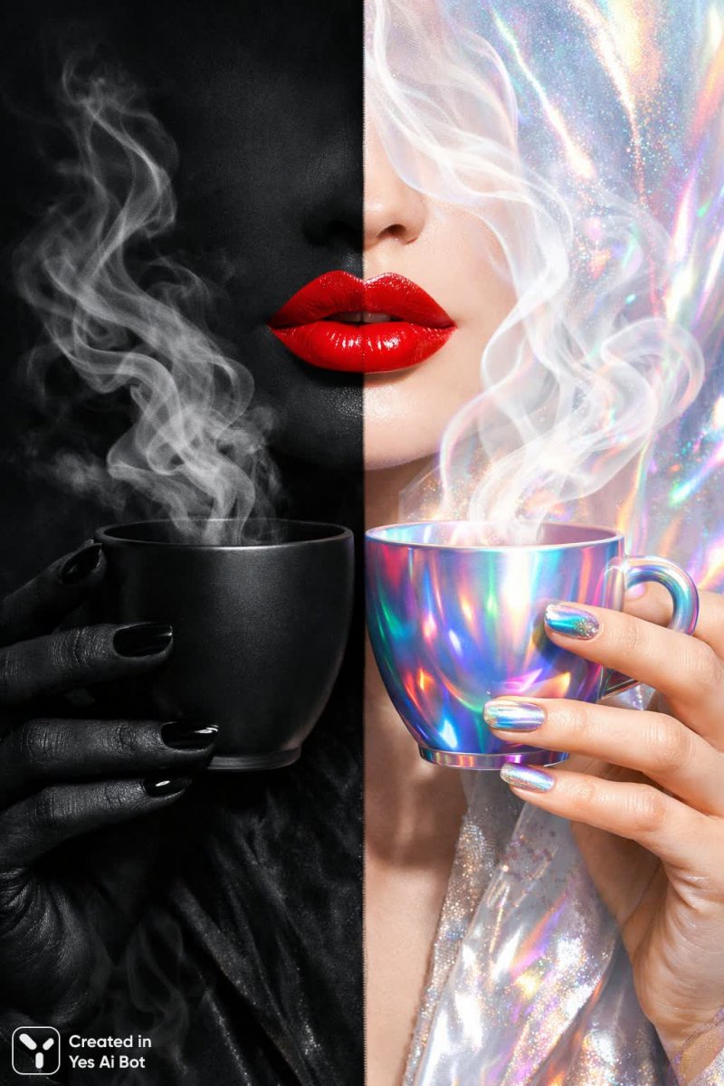 3. an abstract artwork depicts duality through a split personality theme, where a matte black coffee cup contrasts with iridescent decay textures, highlighted by surreal red lips and ghostly whispers.