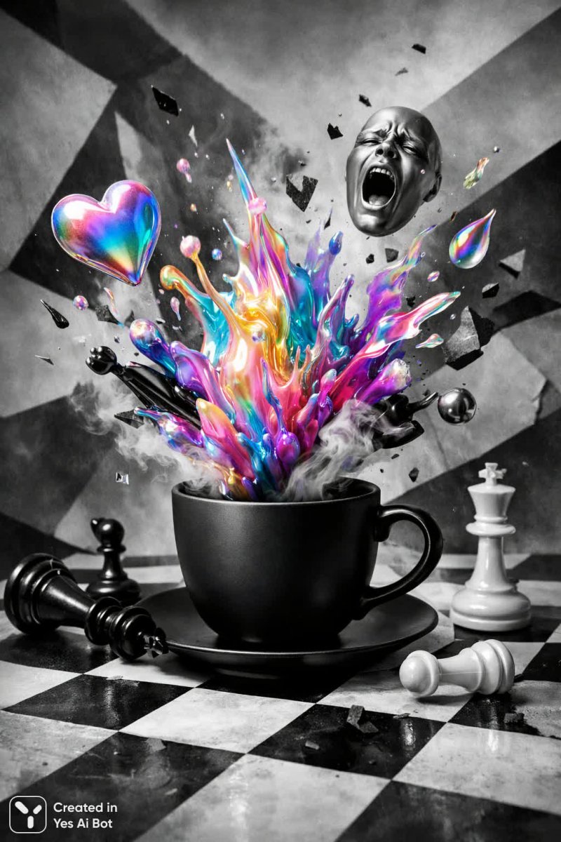 5. an abstract artwork combines surreal elements of a chess game with emotions bursting out, featuring a matte black coffee cup and iridescent decay, set against a monochromatic background infused with a sense of instability.