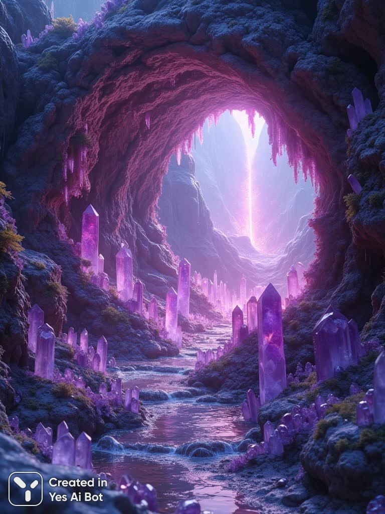 Загадочная пещера кристаллов аметиста и кварца в скале - Картинка, полученная с помощью нейросети Flux