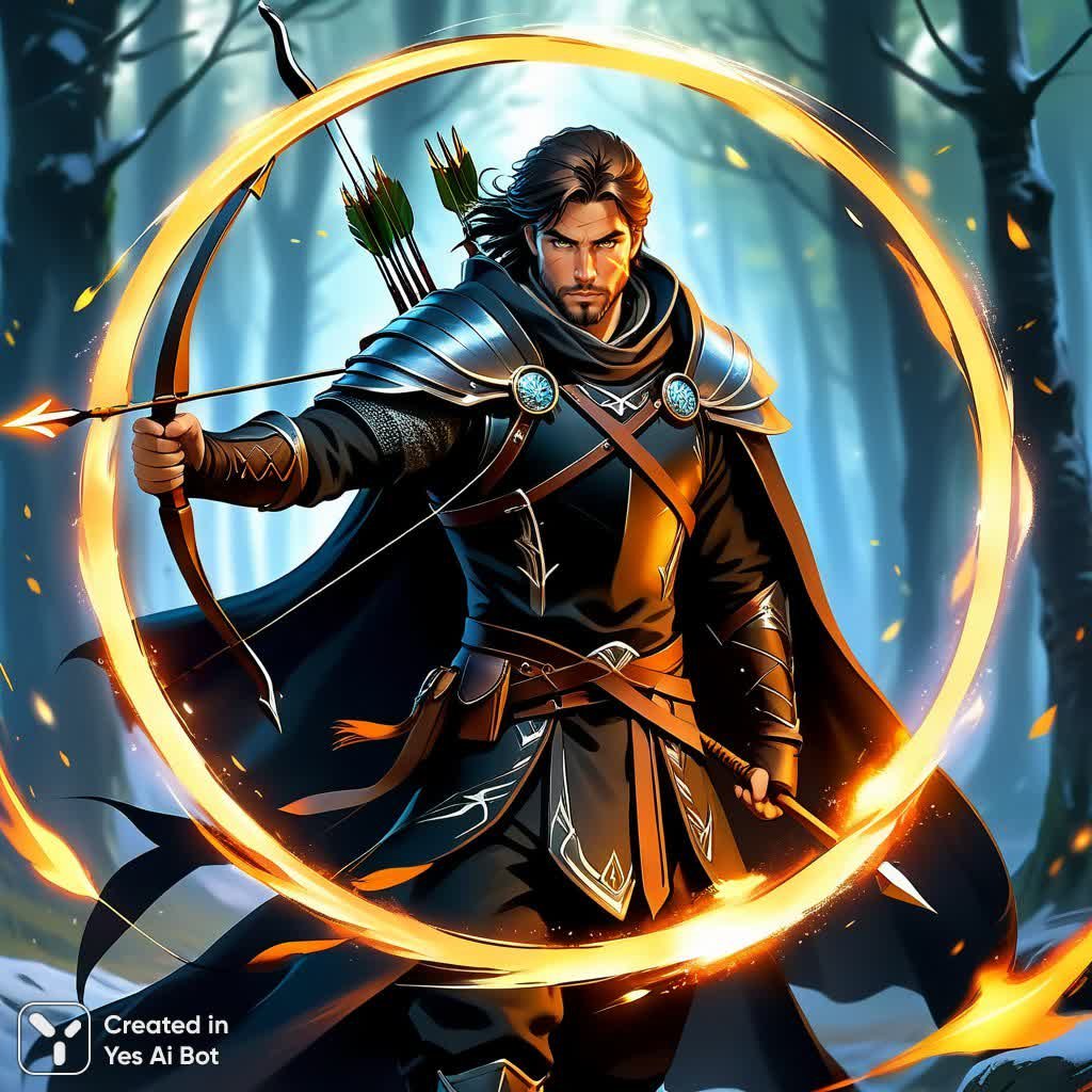 Могущественный воин-лучник, окутанный таинственной аурой магии и защитой длинного развевающегося плаща, готов к решающему выстрелу. Его уверенное и суровое лицо отражает непоколебимость духа и решимость в достижении цели. В руках опытного воина натянута тетива лука, а наконечник стрелы окружен завораживающим сиянием магического пламени. Этот огненный круг украшен древними рунами, словно шепчущими заклинания силы и защиты. Металлический обруч, надежно удерживающий волосы лучника, подчеркивает его дисциплину и готовность к бою. Этот персонаж – воплощение мощи, ловкости и таинственной магии, готовый сражаться за справедливость и отстоять свой мир. Его образ пронизан духом приключений и загадок, а каждый взмах лука обещает невиданную силу и точность. Он - хранитель древних знаний и мастер смертоносного искусства стрельбы из лука, защитник невинных и карающий злодеев. В его глазах горит пламя отваги, а в каждом движении чувствуется уверенность победителя. Этот воин – легенда, ожившая на страницах истории, символ надежды и справедливости для всего мира. Его сила заключена не только в оружии, но и в непоколебимой воле к победе